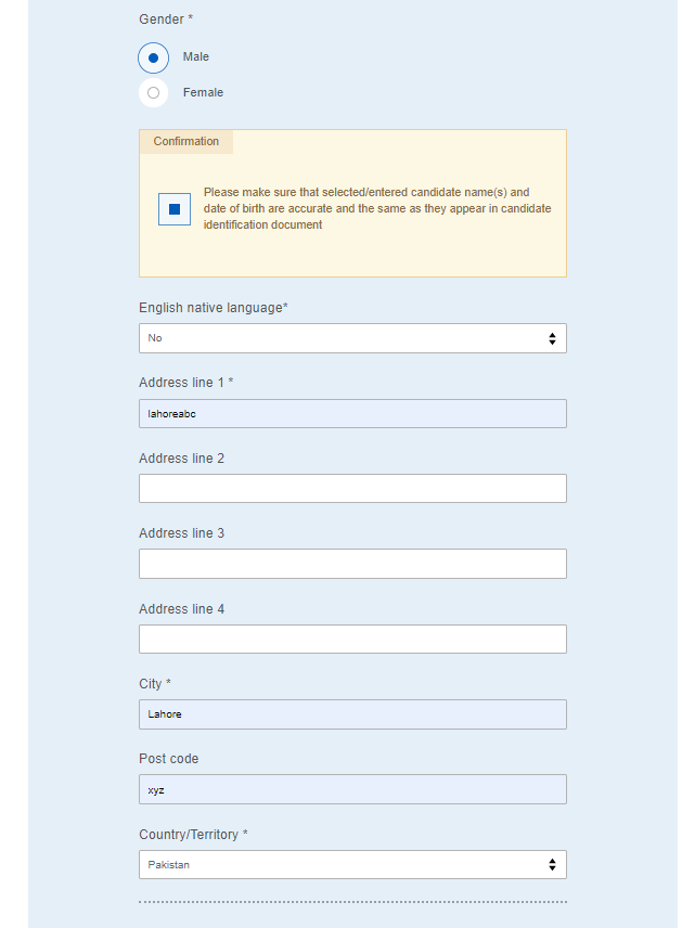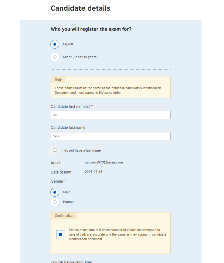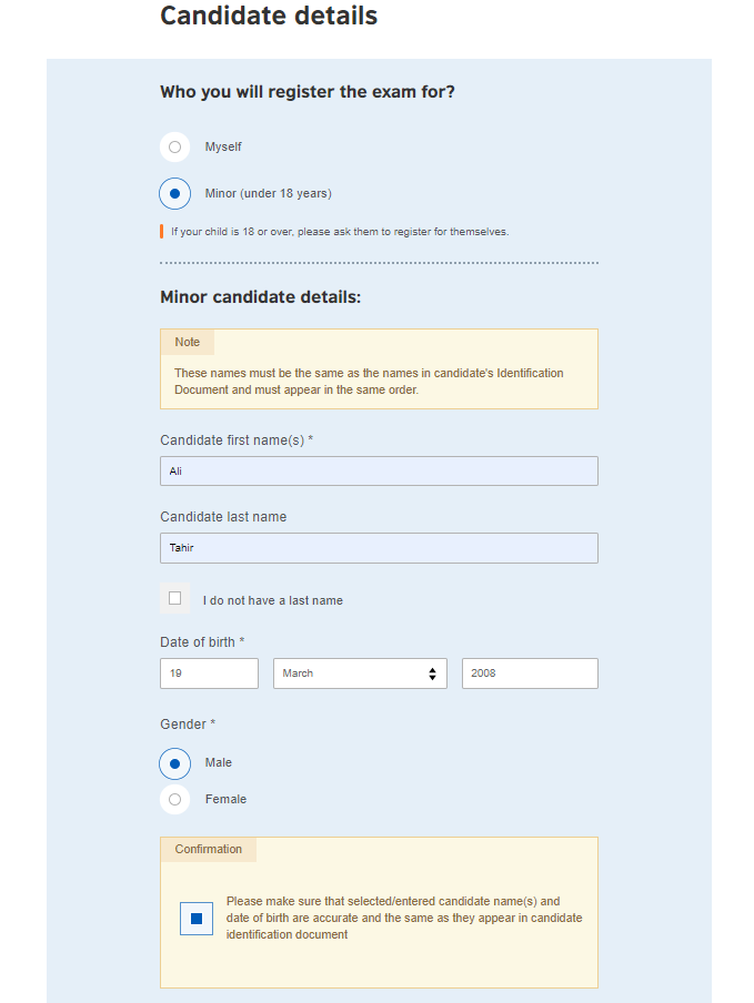 Once you click "Register and pay now," you’ll be taken to the Candidate details form. This is where you provide your personal information for your official exam documents.