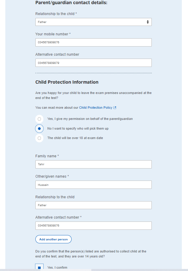 Because the student is under 18, the British Council needs to know who is responsible for them and how they will get home after the exam.