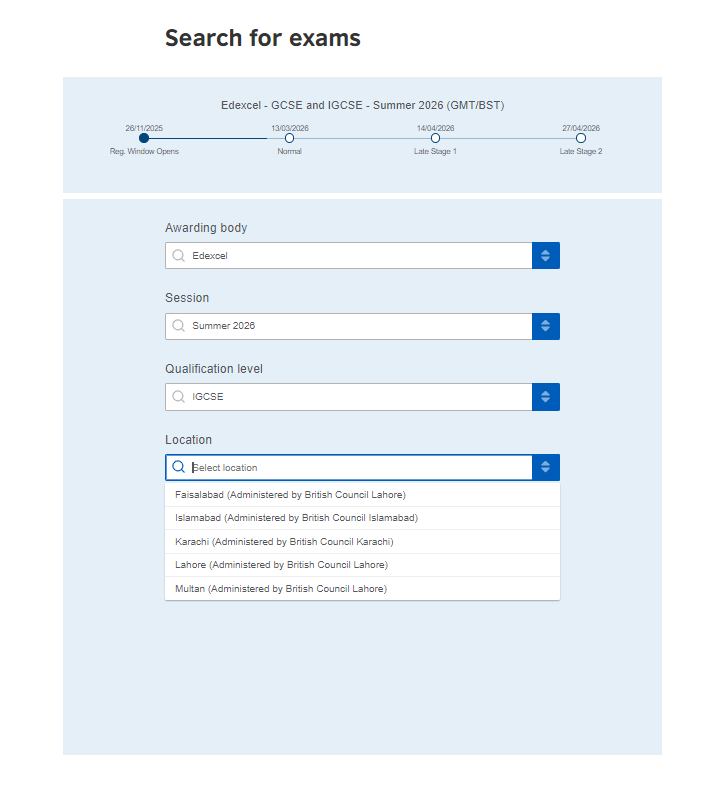 Check the Administering Office: Next to your city, you’ll see which main British Council office is handling your area (e.g., "Administered by British Council Lahore"). This is just for your information so you know who to contact if you have local queries.