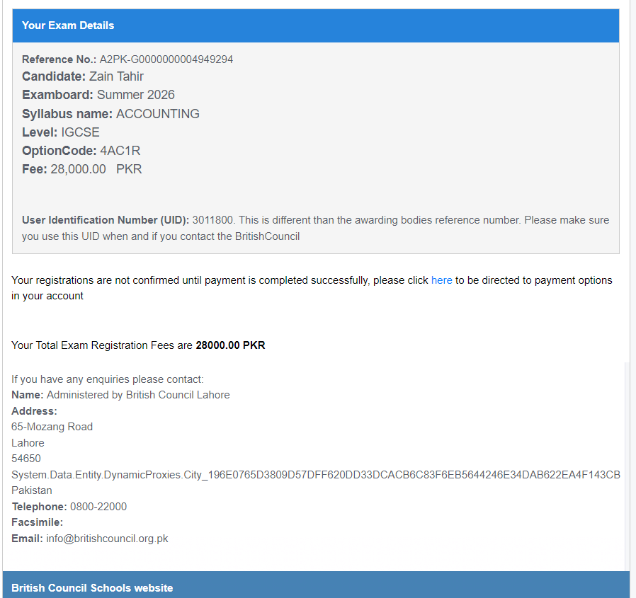 - Keep in Mind: The British Council settled these in foreign currency, so your bank might add a small fee due to fluctuating exchange rates on top of the 28000.00 PKR shown.
